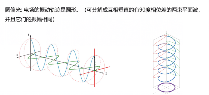 - 圆偏光:电场振动轨迹呈圆形,由振幅相等、相位差 90° 的两束垂直平面波叠加而成。