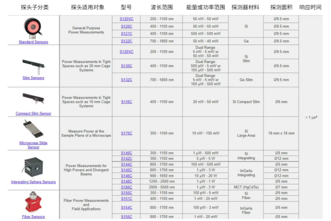 - 通用型探头(如 S120C、S121C):适用于常规自由空间功率测量,波长覆盖 400~1100nm,功率范围 50nW~500mW。
