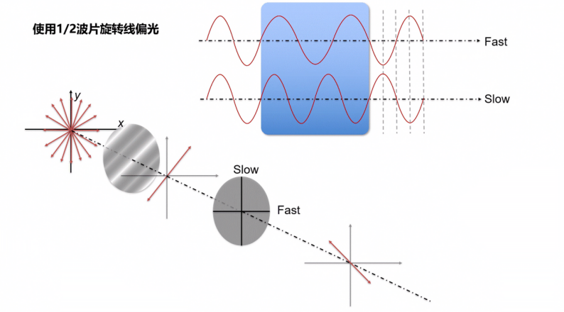 **1/2 波片:**旋转线偏光的振动方向,不改变偏振态类型。