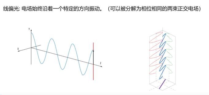- 线偏光:电场振动方向固定,可拆解为相位一致的两束正交电场。