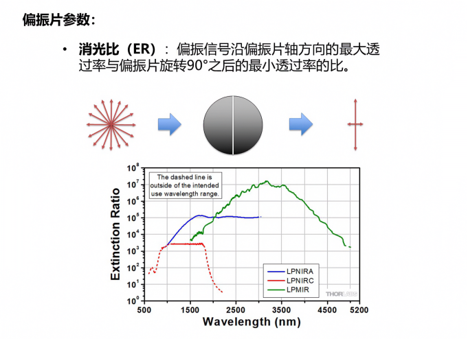 消光比(ER):偏振轴方向最大透过率与正交方向最小透过率的比值,直接决定偏振筛选效果。