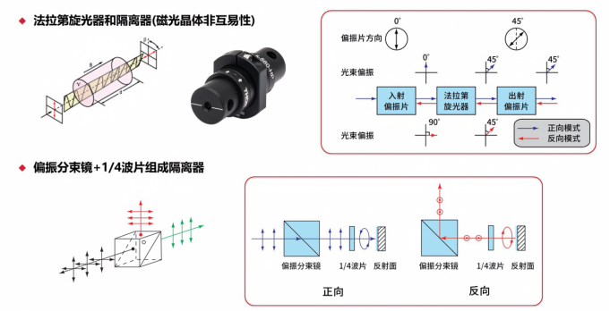 核心元件:法拉第旋光器(利用磁光晶体的非互易性,使光的偏振方向旋转固定角度,如 90°)、偏振片