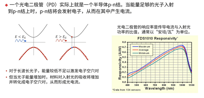 | 光电二极管(PD) | 半导体 p - n 结受光子激发产生电子 - 空穴对,形成光电流 | 响应率(A/W)与波长强相关,依赖材料能带结构,响应速度快 |