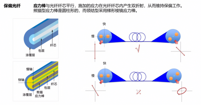 结构组成:纤芯(信号传输核心)、包层(光约束层)、涂覆层(保护与绝缘),含明确的快轴与慢轴标识。