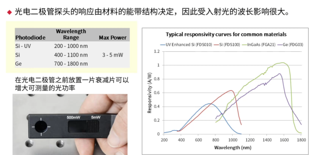 | Si(含 UV 增强型) | 200~1100nm | 通用功率测量、显微镜样品平面功率检测 |