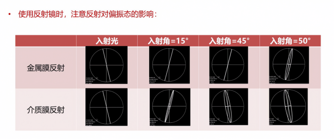- 反射镜:反射对偏振态的影响与入射角相关(15°、45°、50° 差异显著),金属膜与介质膜反射特性不同。