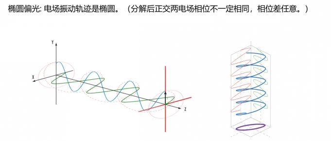 - 椭圆偏光:电场振动轨迹为椭圆,正交电场的相位差无固定值,是最普遍的偏振态。