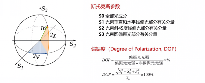 - 斯托克斯参数集:S₀(总光强)、S₁(垂直线偏 - 水平线偏分量差)、S₂(45° 线偏 - 135° 线偏分量差)、S₃(右旋圆偏 - 左旋圆偏分量差),完整描述偏振特性。