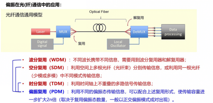 - 偏振复用(PDM):利用正交偏振态传输信息,可与其他复用技术结合,使传输容量扩大 2n 倍(n 为偏振态对数)。