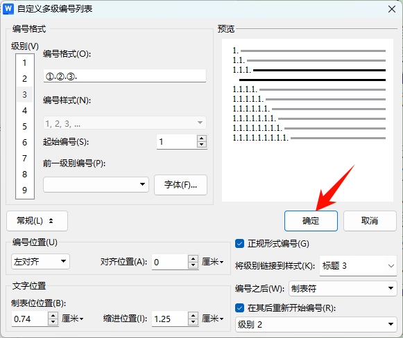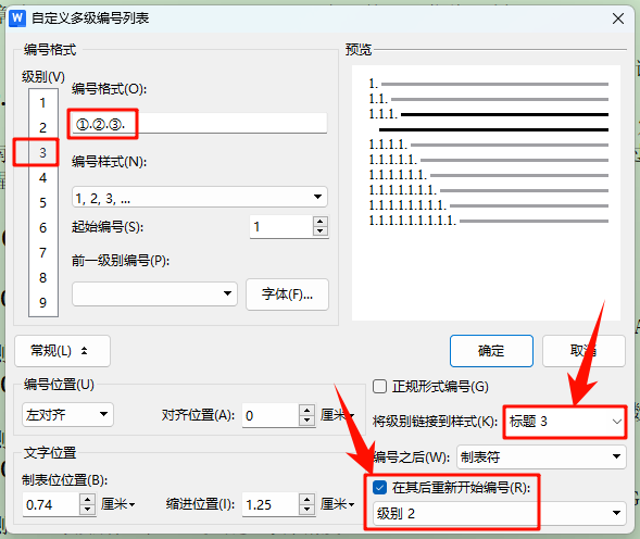进入详细设置界面后,核心逻辑是「从高到低」设置(级别:1→2→3),让下级编号主动关联上级编号,这样才能实现级联更新。下面以三级标题为例,一步步说明。