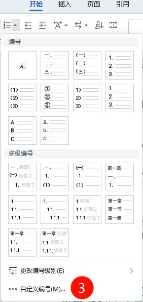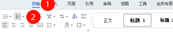 首先,打开需要设置的WPS文档,在顶部菜单栏找到【开始】选项卡,定位到【编号】按钮,点击按钮右侧的「下三角」展开下拉菜单。