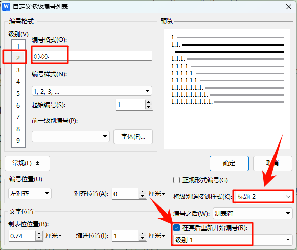 同样操作二级标题编号:选中级别"2"(对应二级标题),区别在------勾选"在其后重新开始编号",并选择"级别1"。这样就把一级标题的编号关联过来,二级标题就会自动跟随一级标题的编号变化;