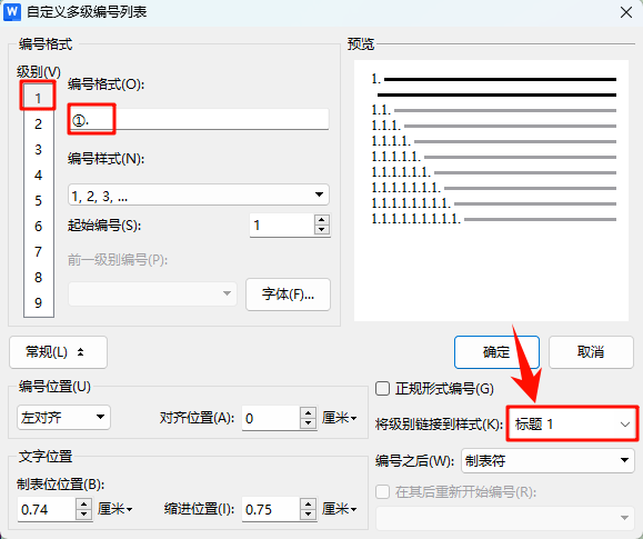 在左侧"级别"列表中选中"1"(对应一级编号),在右侧"编号格式"区域,选择你需要的编号样式(比如"1. ""一、"等),确认参数后,在"将级别连接到样式"选择【标题1】(这样一级编号就对应一级标题了);