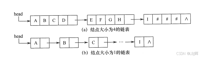 类似于线性表的链式存储结构,也可采用链表方式存储串值。由于串的特殊性(每个元素只有一个字符),在具体实现时,每个结点既可以存放一个字符,也可以存放多个字符。每个结点称为块,整个链表称为块链结构。如图 4.1(a) 是结点大小为 4(即每个结点存放 4 个字符) 链表,最后一个结点占不满时通常用 "#" 补上;图 4.1(b) 是结点大小为 1 的链表。