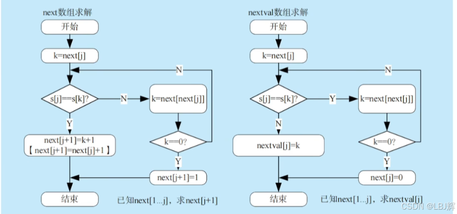 如果出现了,则需要再次递归,将 next[j] 修正为 next[next[j]],直至两者不相等为止,更新后的数组命名为 nextval。计算 next 数组修正值的算法如下,此时匹配算法不变。