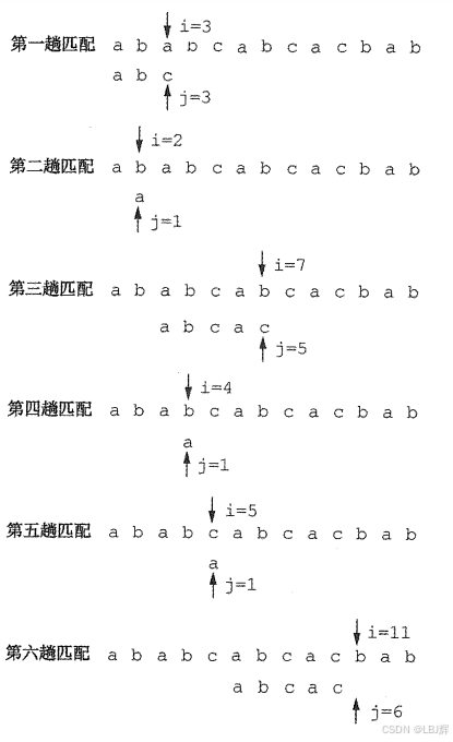 图 4.2 展示了模式 T='abcac' 和主串 S 的匹配过程。