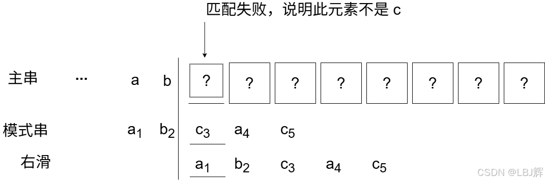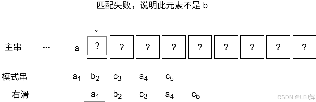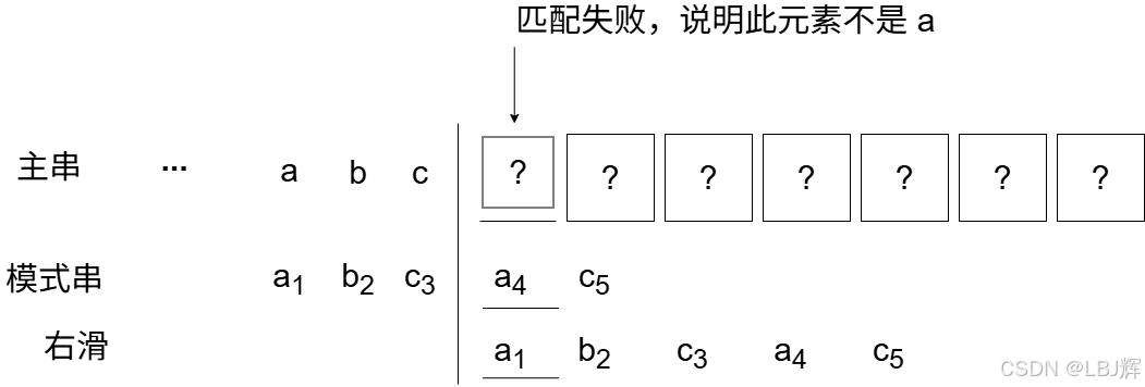 还有一种特例,在上述举例中并未出现,当某趟第一个字符比较就失配时,应如何处理呢?此时,应让模式串向右滑动一位,再从主串当前位置的下一位开始比较。