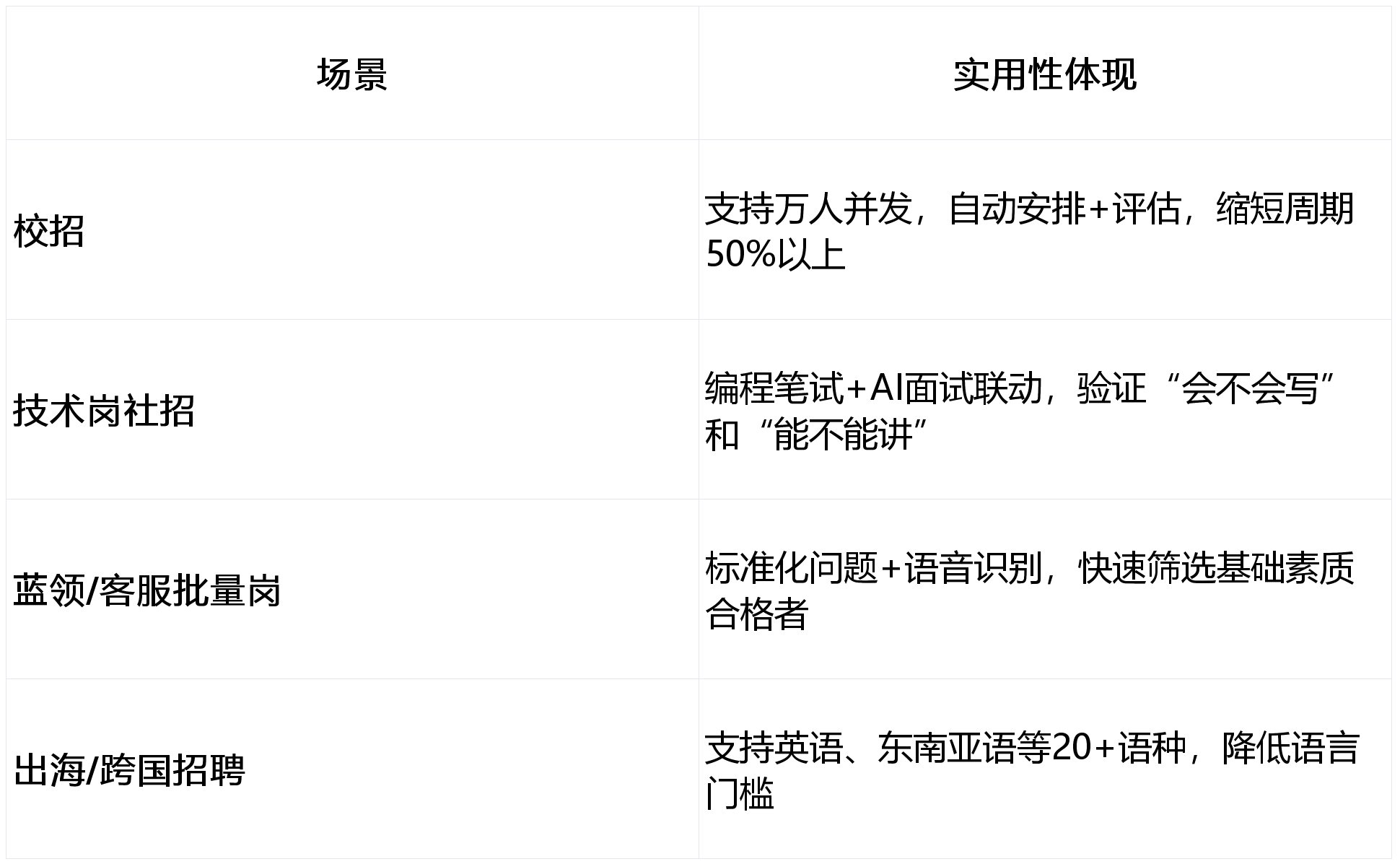 - AI优势:同一岗位所有候选人面对相同评估逻辑,评分维度一致