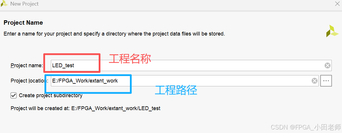 **第二步:**创建一个名为LED_test的工程到对应的文件目录下,文件路径可以自定义,但是不能有中文和非法字符,点击Next