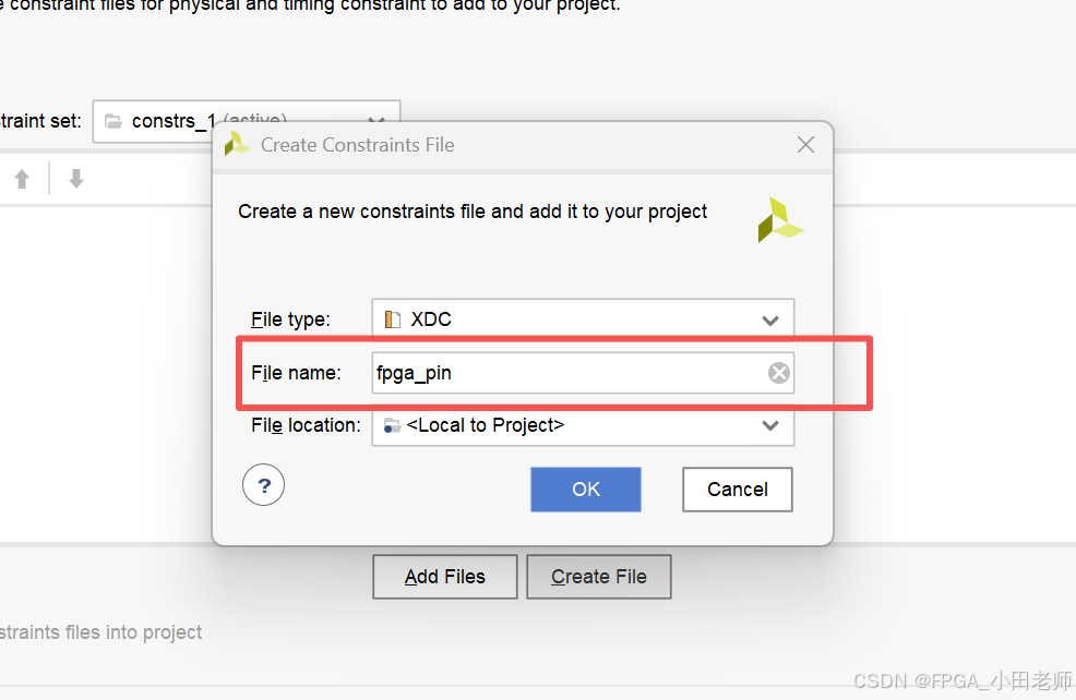 **第二步:**点击Create File创建一个新的xdc文件,命名为fpga_pin点击OK-->Finish