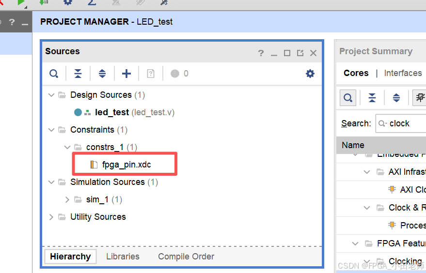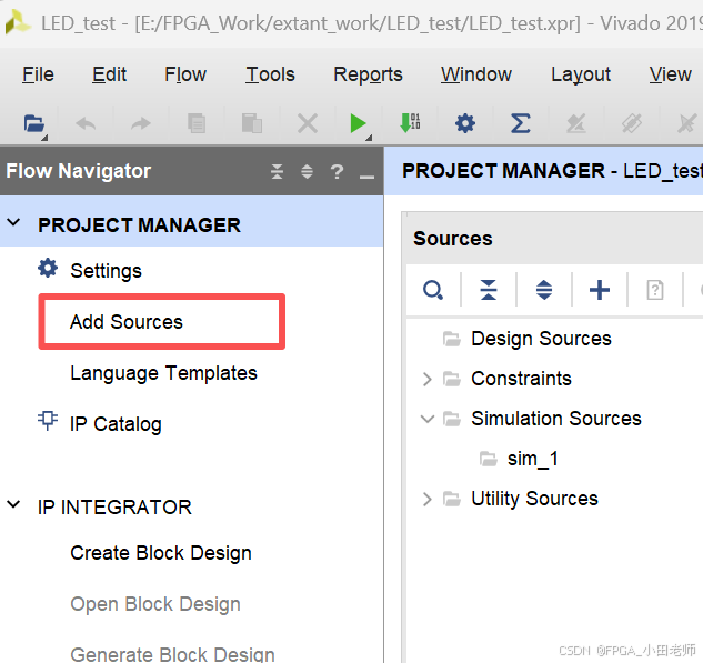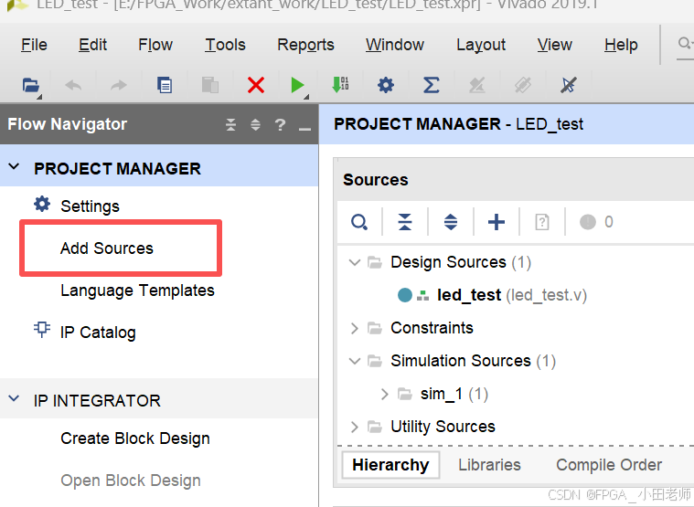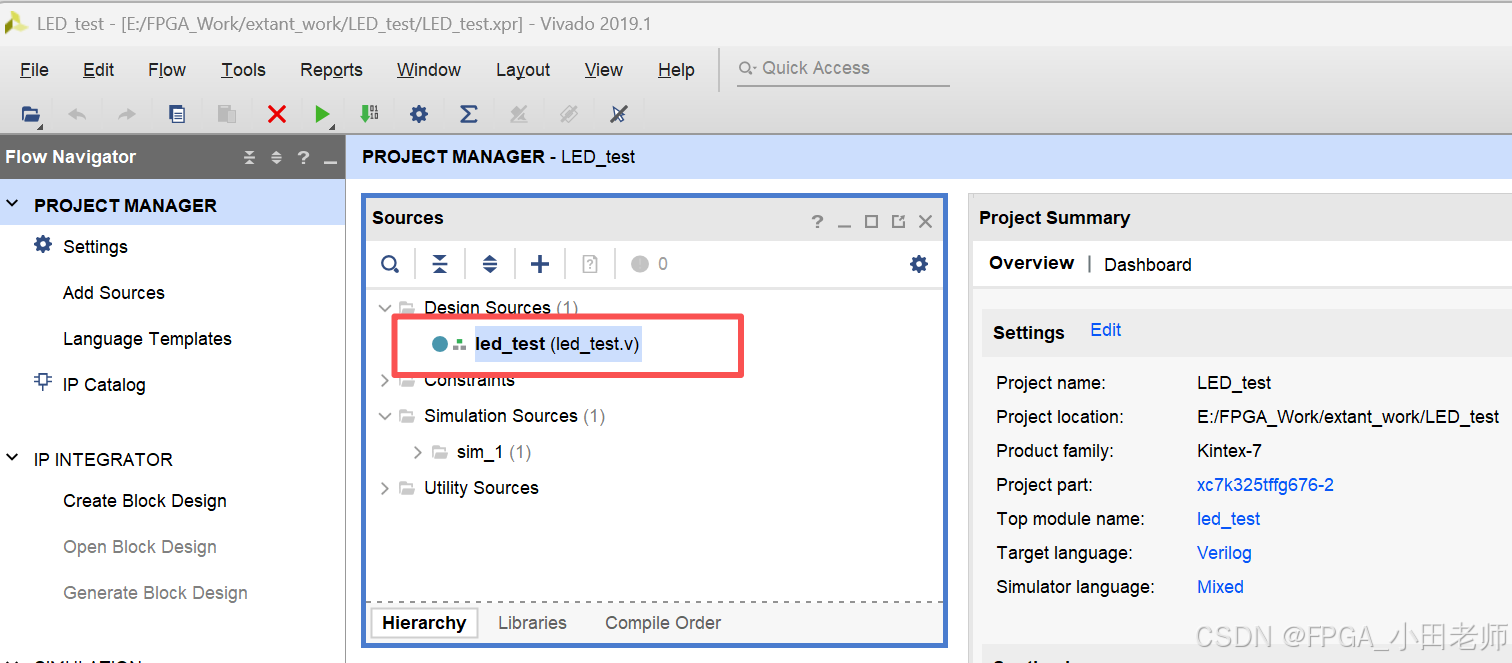 **第三步:**创建完成后,我们就可以再Design Sources里面看到这个led_test.v的文件了,这个文件就是我们用来编写Verilog程序的文件。