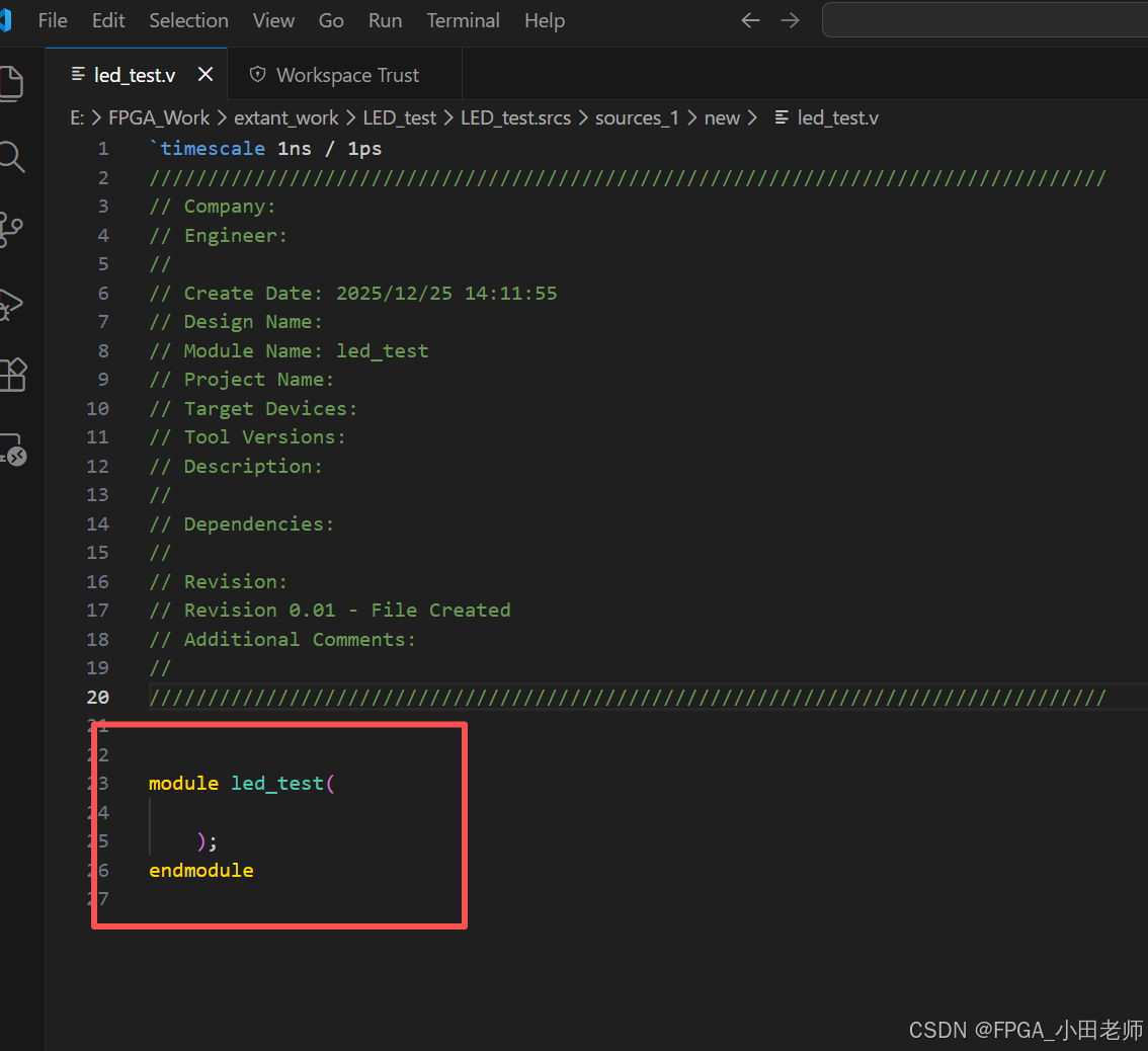 双击打开led_test.v文件,我们可以看到,工具已经帮我们写好了module 名称,需要我们自己来编写输入输出和逻辑代码。