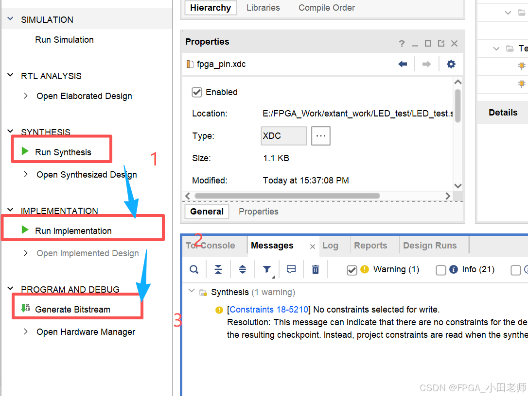 依次点击Run Synthesis(综合)--->Run Implementation(实现)--->Generate Bitstream(生成bit),完成bit文件的生成。