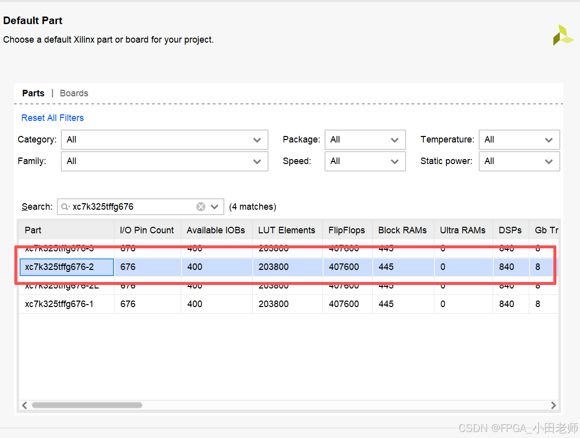 **第四步:**选择FPGA芯片的 型号、封装、速度等级----点击Next