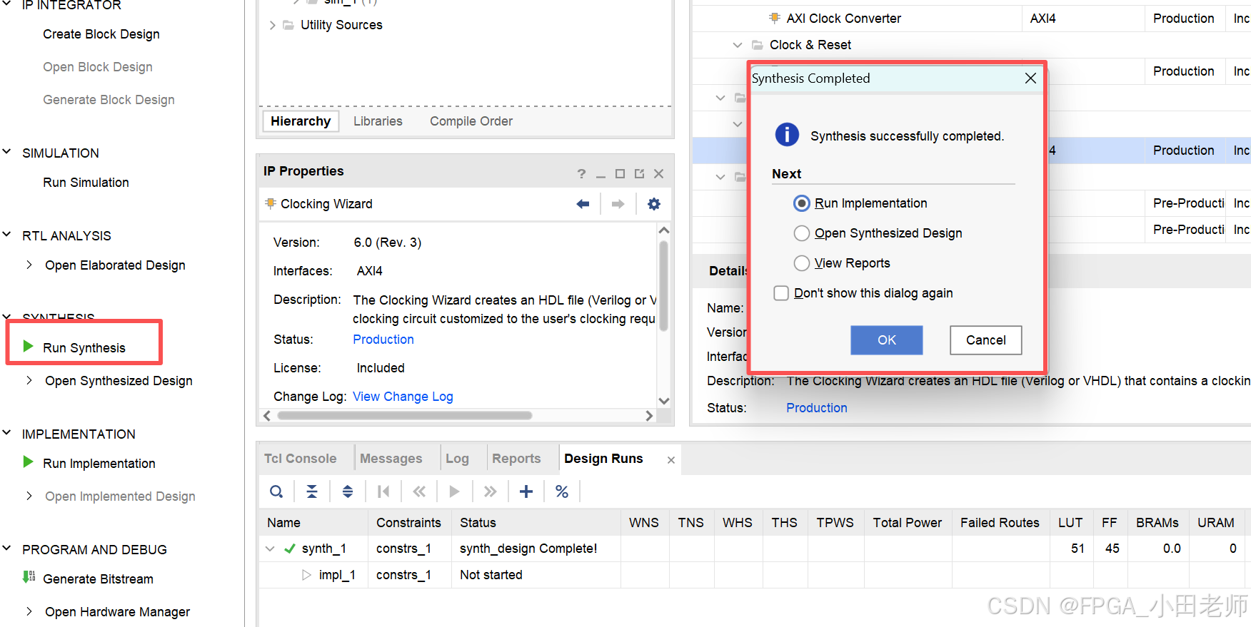 这样我们就编写好了LED流水灯的测试代码,使用Run Synthesis先综合一下看是否有语法错误