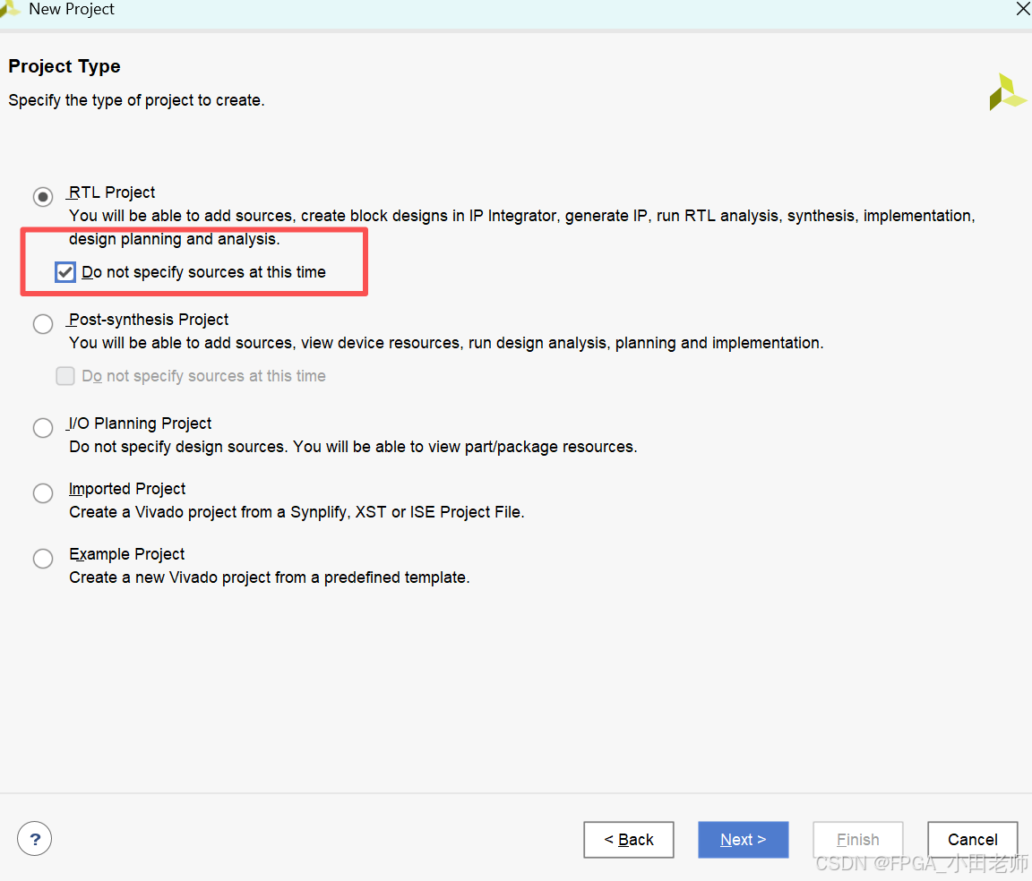 如果不勾选复选框,next之后就会跳出创建和选择.v文件的界面,但是我们一般都不会在这里添加文件,而是在整个工程创建好之后再添加,所以这里就把复选框勾上就能直接到选择器件的界面了。
