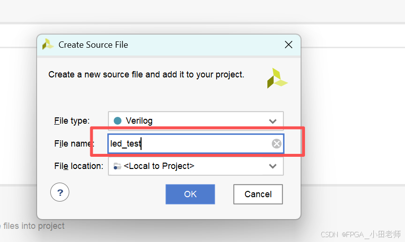 **第二步:**点击Create File,创建一个名为led_test的verilog文件,点击ok