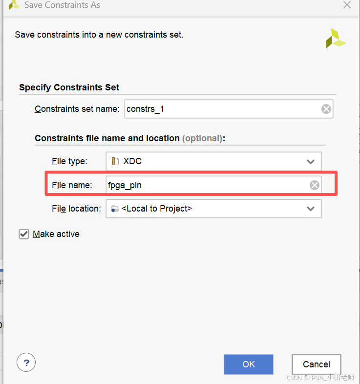 **第四步:**点击保存,并给xdc文件命名为fpga_pin即可