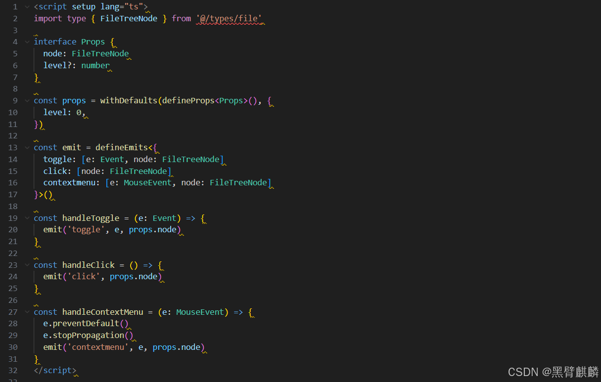 这个组件接收一个 node 属性和可选的 level 属性(用来控制缩进)。通过 emit 定义三个事件:toggle(展开/折叠)、click(点击选择)、contextmenu(右键菜单)。