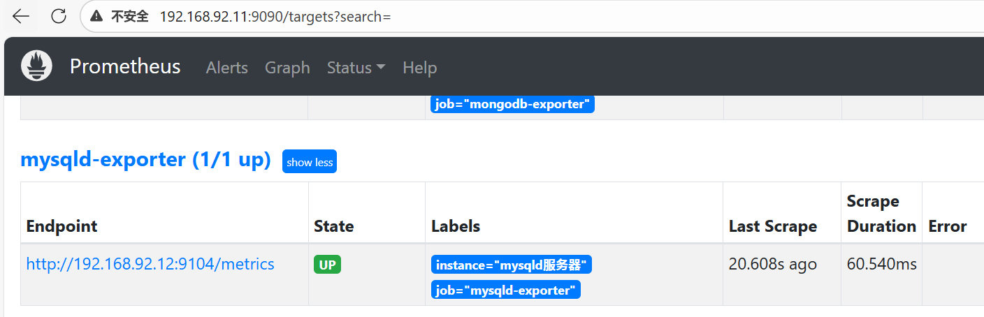 刷新访问http://192.168.92.11:9090/targets?search=,确认新监控的mysqld服务器是否生效