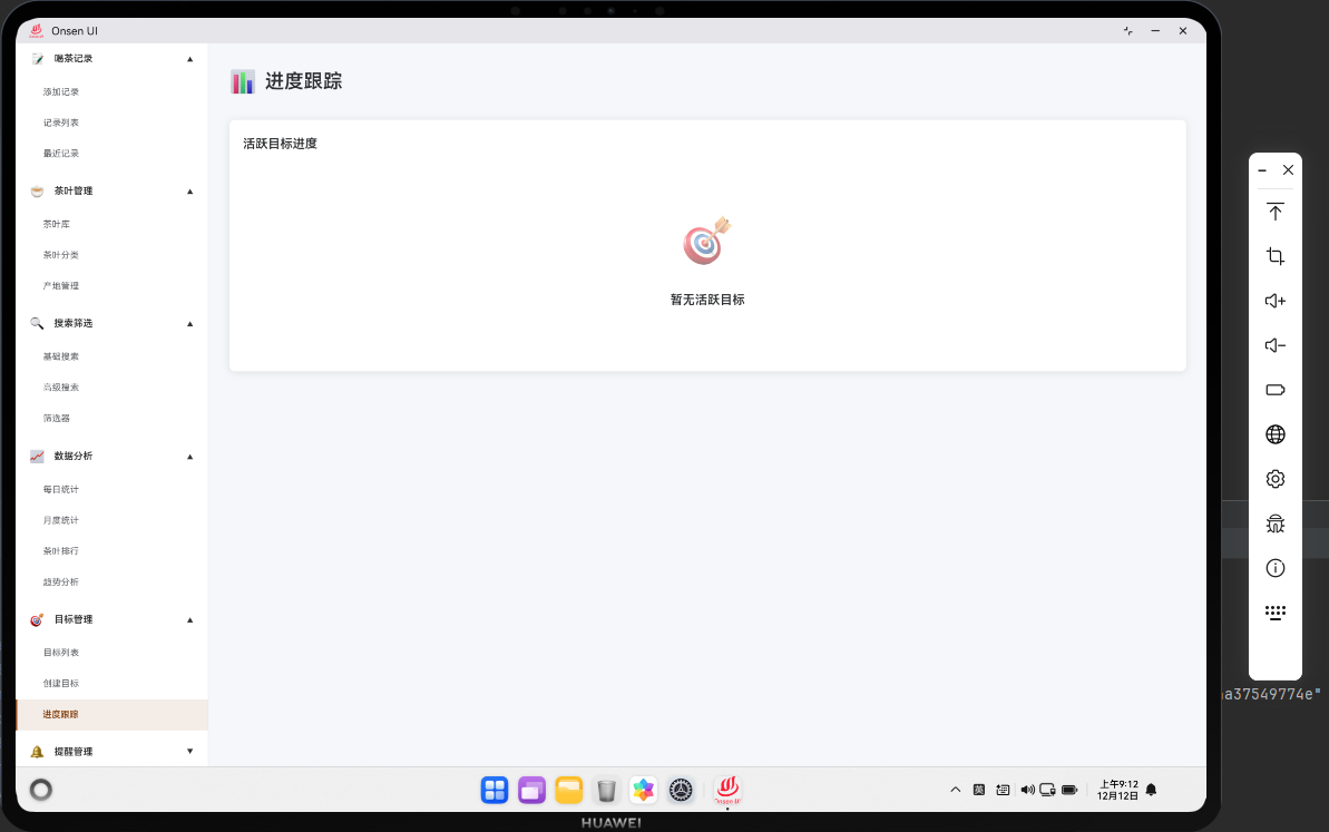 进度跟踪模块允许用户跟踪目标的完成进度。该模块集成了 Cordova 框架与 OpenHarmony 原生能力,提供了完整的进度更新和可视化展示。用户可以查看目标的当前进度、剩余时间和完成预测。模块支持进度的快速更新和历史记录查看。