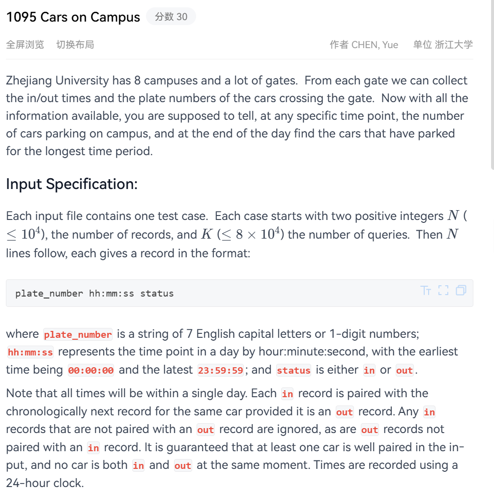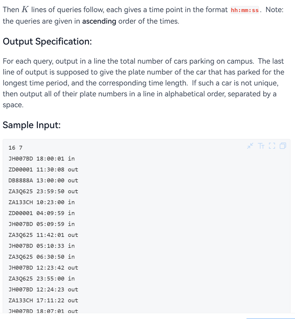 这一题的大意是说给出N条记录,这N条记录里面有进入停车场的也有出停车场的,现在我们要做的是给出K条询问,问在某一个时刻,有多少辆车在这个停车场中,在一天内停在停车场中时间最长的车牌号是多少,如果有多个,按照车牌号从小到大输出。