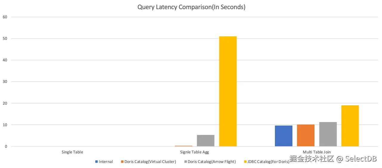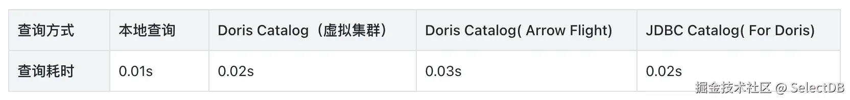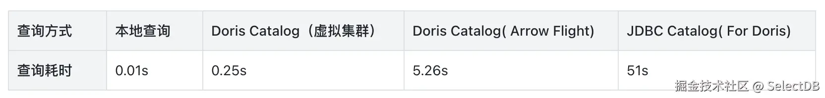 - 在单表简单查询(直接查询远端集群)模式下:Doris Catalog 与 JDBC Catalog 基本持平。