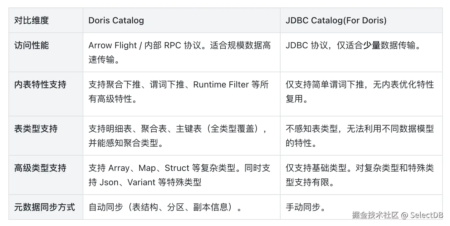 那么,与 JDBC Catalog 相比,Doris Catalog 到底具备哪些能力优势呢?