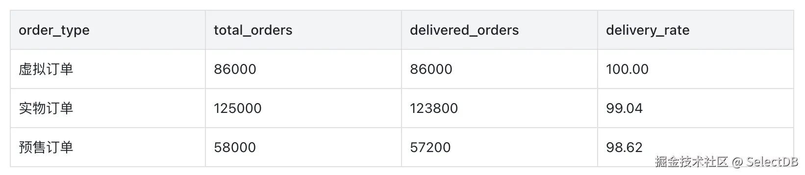 logistics_db.delivery_info(履约表); - 业务需求:计算近 7 天各订单类型的履约率(已履约订单数/总订单数),支撑运营决策。