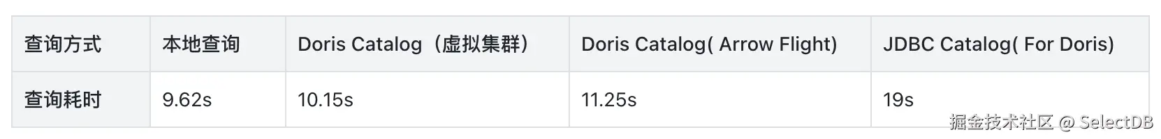 - 在多表关联查询(两个大表分别存储在本地和远端集群,进行关联查询)模式下 :Doris Catalog 两种模式均优于 JDBC Catalog,相较于 JDBC Catalog,速度提升约 42%。