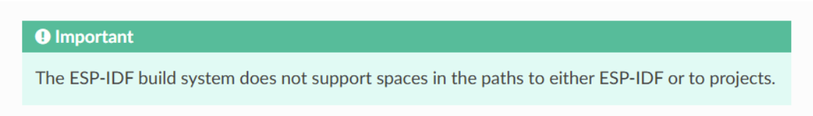 hello_world来测试环境安装正确与否。但是官方说明明显更加细致,如下图,会特别标注ESP_IDF的工程路径是不支持空格的。