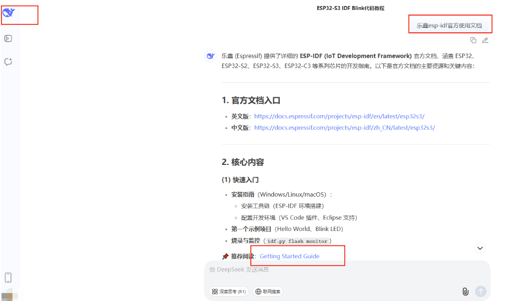 借助AI工具快速找到相关学习资料(这个提示词其实需要细化下,加上ESP32S3这个芯片类型会更好。这里之所以没加还能定位是因为这个对话之前的提问已经给过芯片型号了。DS会默认在同一语境下回答。)