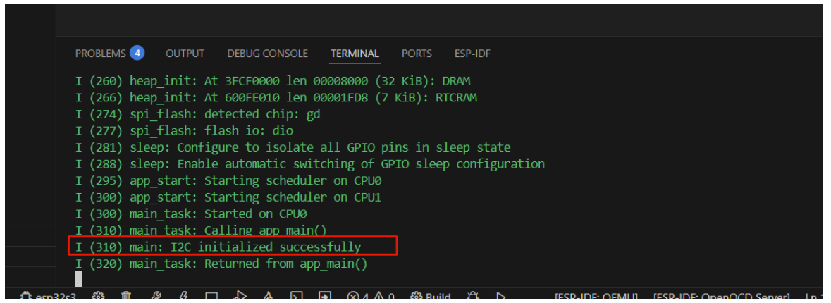 c++#include <stdio.h> #include "esp32_s3_szp.h" static const char *TAG = "main"; void app_main(void) { ESP_ERROR_CHECK(i2c_master_init()); ESP_LOGI(TAG, "I2C initialized successfully"); } -