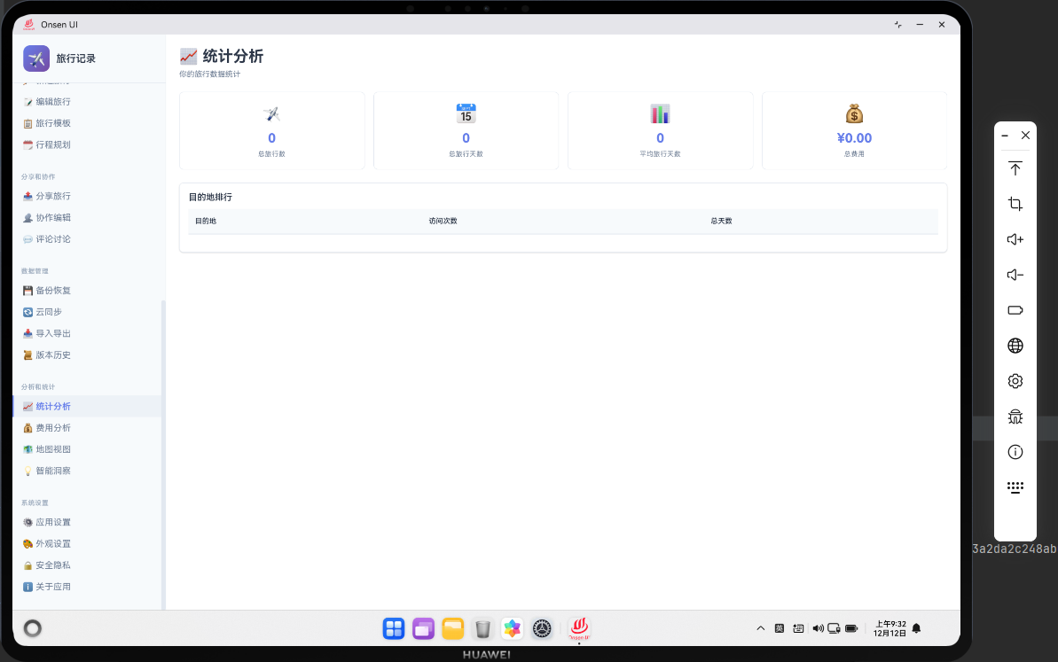 统计分析功能提供了旅行数据的深度分析。用户可以查看旅行的统计数据,如总旅行数、总花费、平均花费等。统计分析还支持按目的地、时间等维度进行分析。在 Cordova 与 OpenHarmony 的混合开发框架中,统计分析需要实现复杂的数据计算和可视化。
