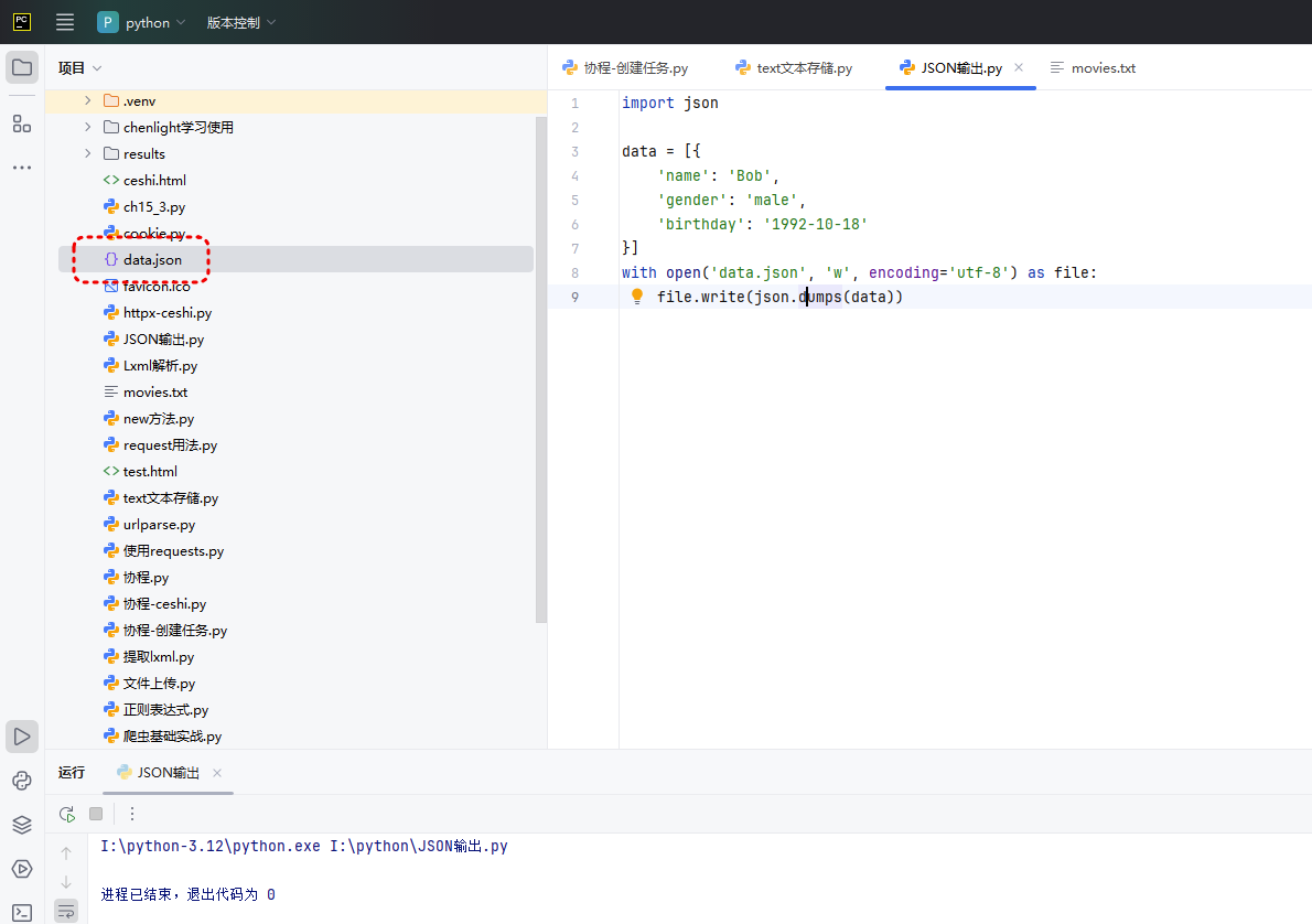 虽然你可以用 file.write(json.dumps(data)),但更推荐使用 json.dump() 直接写入: