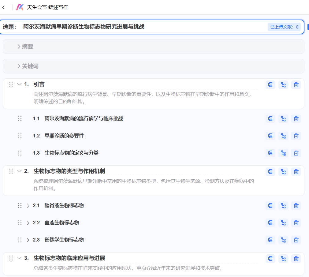 确定方向后,真正的效率提升开始。"智能大纲生成" 功能会基于你的选题,自动分析该领域的知识脉络,生成一个结构完整、逻辑层级清晰的综述大纲。这个大纲不是随意的列表,而是包含了引言、主体章节(如研究背景、方法演进、现状分析、挑战展望等)和结论的完整框架,为你提供了坚实的写作蓝图。