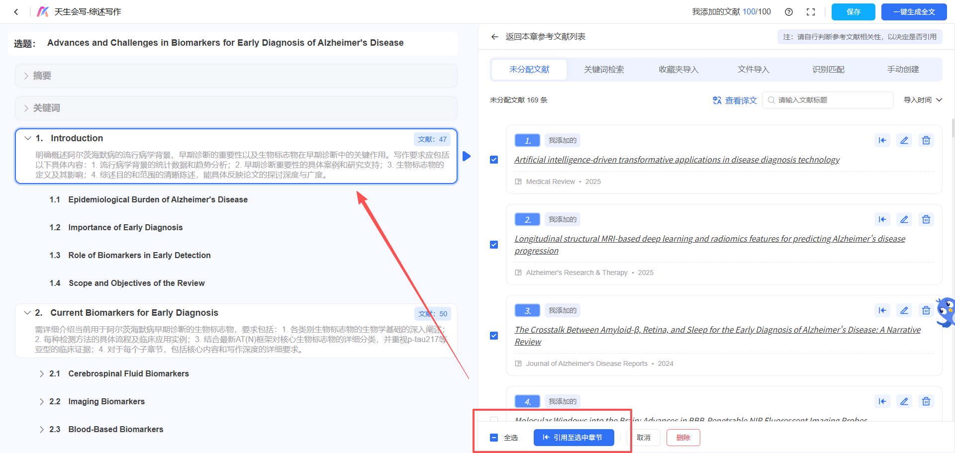 更关键的一步在于 " 章节文献分配" 。添加文献后,AI会初步建议每篇文献最适配的章节。你可以在这个界面进行全局预览和手动拖拽调整,确保支撑每一章节观点的文献都是最相关、最有力的。这一步确保了文献与内容的高度契合,避免了"文献堆砌"和"张冠李戴"。