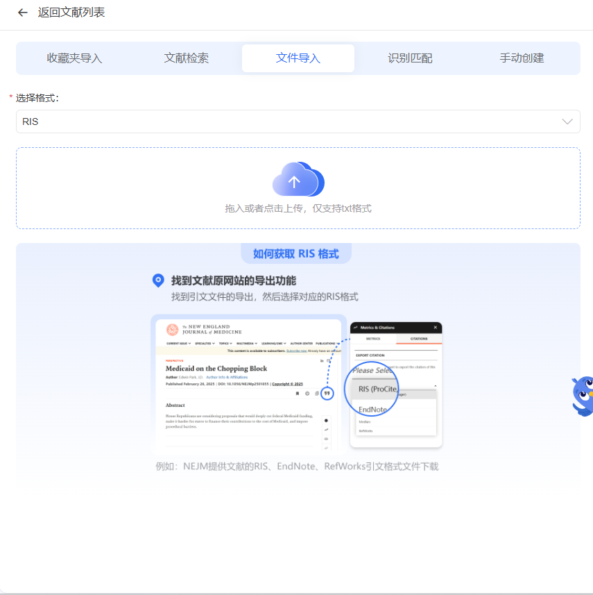 - 收藏夹/文件导入:如果你在MedPeer文献库已有积累,或本地有EndNote等管理的文献库,可以直接批量导入,无缝衔接。