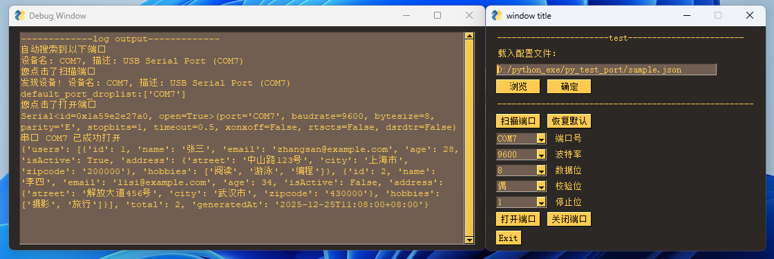 简单实现了打开后自动搜索存在的串口,也可以点击扫描端口进行扫描,默认9600波特率,8数据位,偶校验,1停止位。大家可以自行修改,或者通过载入json文件修改(只做了入口没实现)。