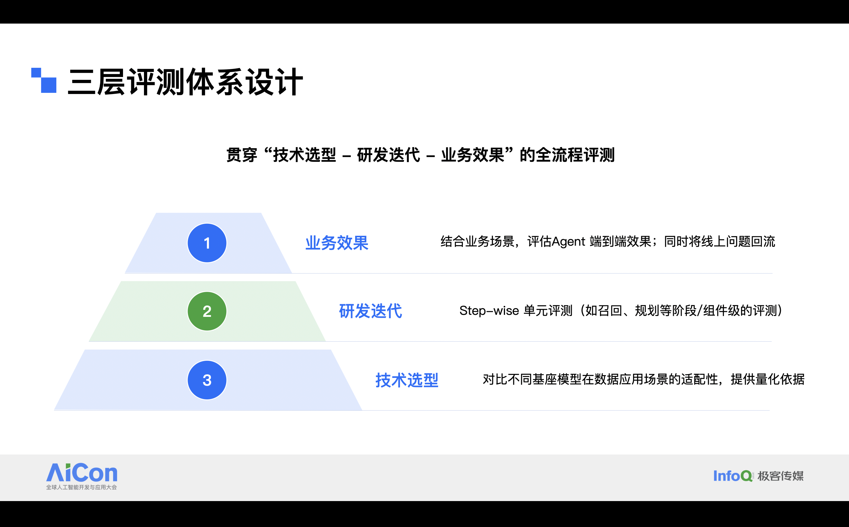 最上层才是端到端的业务效果。最终要用一套覆盖完整链路的评测集与流程,加上相应的方法实践,来衡量这个 Agent 在真实任务中的表现到底如何。